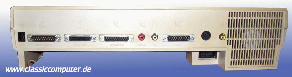 Die Anschlüsse von links an: Tastaturkabel (4P4C ähnlich einem Telefonhörerkabel), daneben Drucker, Diskdrive, serieller Anschluss, Audio Ausgänge, RGB Monitor Anschluss, TV und Video-Chinch Anschluss | |