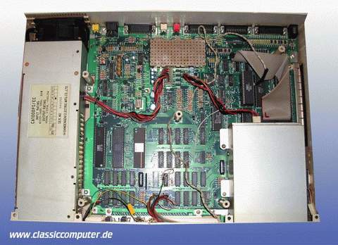 Das Board des Amiga 1000 ist recht aufgeräumt, oben rechts die CIA Bausteine, der Chipsatz unten links die drei großen IC. Unter dem Floppykabel der Prozessor. Unten mittig die RAM ICs sowie diverse Logik ICs. Das Diskettenlaufwerk ist mit 880 KB DD Kapazität versehen und wird "nebenbei" von dem Soundchip gesteuert. |