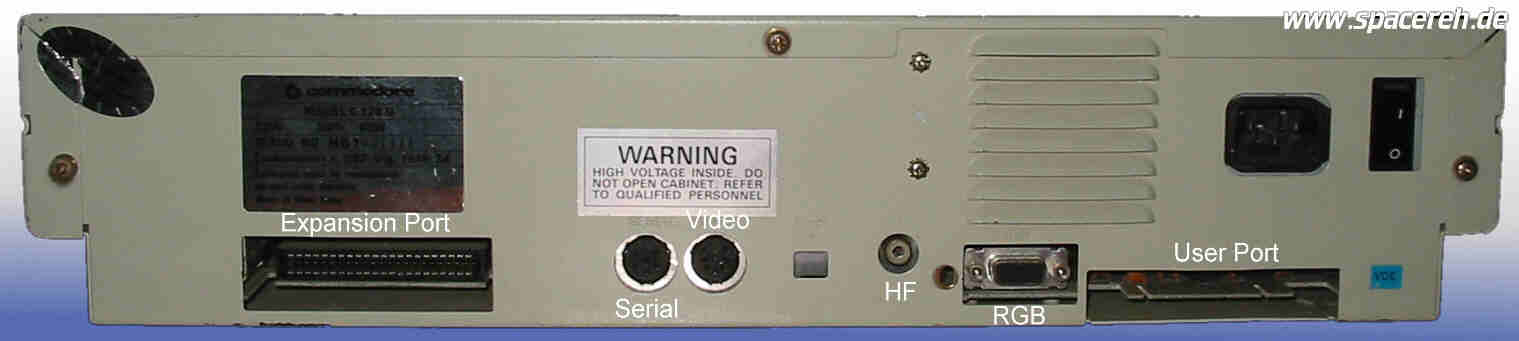 | Die Rücksicht ist ziemlich identisch mit den Anschlüssen des normalen C 128. Expansion Port, Serial, Monitor, TV HF, RGB und User Port. Der Datasettenport ist jetzt seitlich. | |
