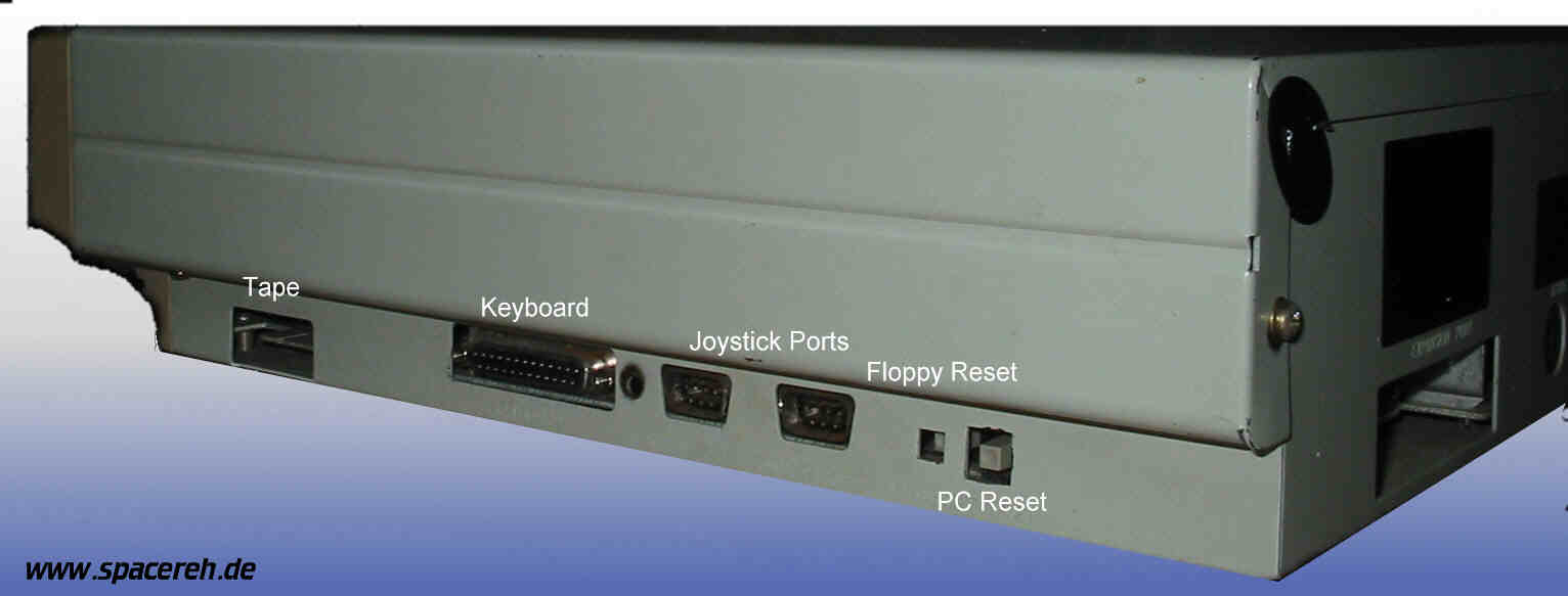 | Die Seitenansicht offenbart den Tape Anschluss für die Datasette, Anschluss für die externe Tastatur, zwei Joystick Ports, den Floppy Reset (etwas tiefer gesetzt) und den Reset für den ganzen Computer. | |