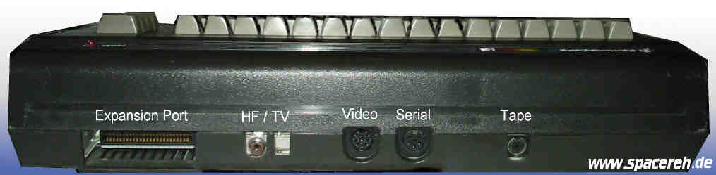 | Recht magere Ausstattung an Anschlüssen, nur ein Expansion Port, HF Anschluss, Serial, Monitor und der Datasetten Anschluss in neuer Form. Das Gehäuse ist reine Platzverschwendung siehe Bild unten. | |