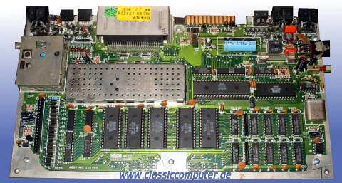| Das Board, von links an : Tastatur Anschluss, ROM, Speicher unter dem Blechdeckel der TED daneben die CPU. | |
