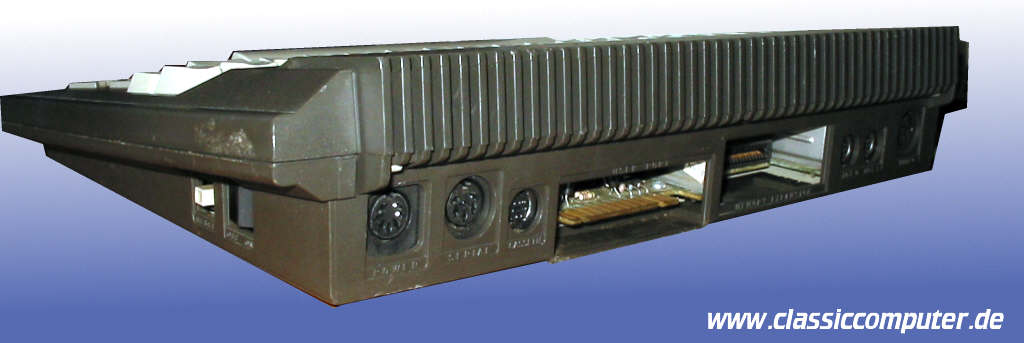 | Die Anschlüsse des Plus/4, von links an : Reset, Powerschalter, Netzteilanschluss, Seriell, Datasette, User Port, Expansion Port, 2x Joystick und der Videoanschluss. Nicht zu sehen der TV Modulator auf der rechten Seite. Es gibt zwei Modelle, einmal mit runden Stromanschluss und mit eckigem Anschluss ähnlich dem Amiga Anschluss. | |
