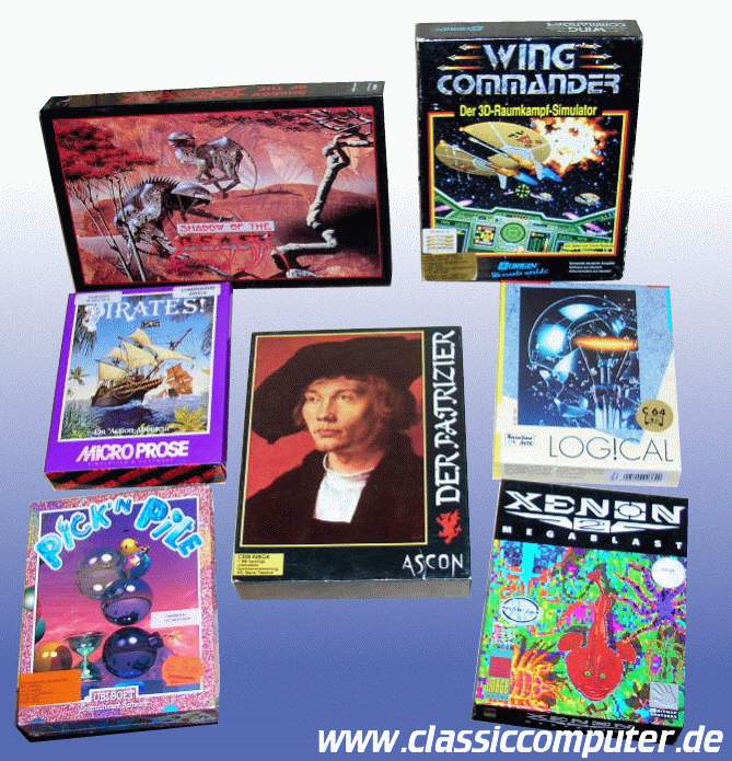 Hier einige Amiga Spiele: Oben rechts Shadow of the Beast, daneben Wing Commander, darunter Pirates und Patrizier. Logical für C64, Pick´n Pile für C 64 und Xenon II - Megablast für den Amiga. |