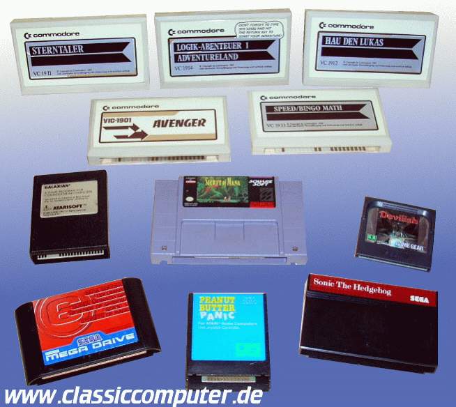 Einige Spielmodule aus den Anfängen, oben VC20 Module, darunter v.l. an: Atari Modul für C 64, Super Nintendo US Modul, Gamegear, sowie darunter Mega Drive, Atari XL und Master System Modul. |