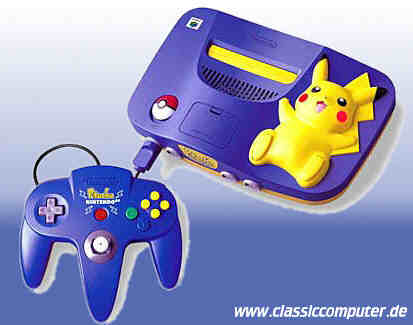 Das wahrscheinlich schlimmste was man den N64 Besitzern antun konnte: Eine Pokemon Version des N64. Zeitgleich mit diversen Pokemon Spielen erschienen, sollte es jüngere Käufer für das N64 begeistern. Pikachu ist nicht nur Deko, ein Druck auf den linken Fuß löst einen Reset aus. |