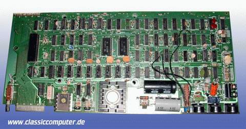 Das Board des Tandy zeigt anfängliche Computer Technik, viel TTL-Logik, den Prozessor sowie das Basic ROM und die Spannungsversorgung unten mittig. | |
