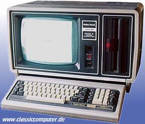 Hier das Modell II des TRS-80 mit eingebautem Monitor und 8 Zoll Diskettenlaufwerk. Beachtenswert die Tatsache, das sich hier ein Heimcomputer im Laufe der Zeit zu einem Bürocomputer mausert. |